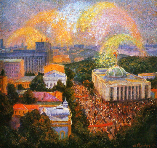 “Давно я думав і відчував, що між Карпатами і Києвом багато спільного в структурно-пластичній побудові рельєфу, – розмірковує митець. – Окрім того, Київ ніби моноліт і в історичному розумінні. І доля у нього сувора, буремна й прекрасна, ніби Карпати. Я настільки люблю Київ, що довгі роки не наважувався писати його, а лишень придивлявся до нього і прислухався до себе, робив зарисовки, невеличкі робочі етюди. Й нарешті, думається, побачив місто по-своєму, що надало мені сміливості й снаги”.