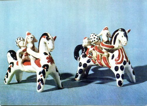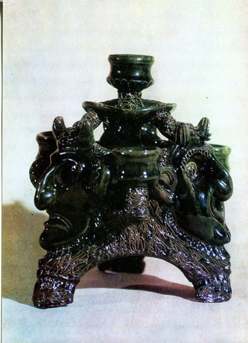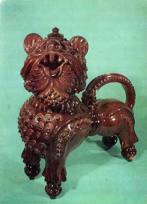 Пластично довершені фігурні посудини у вигляді левів та баранців створює на заводі “Художній керамік” заслужений майстер народної творчості УРСР Іван Білик. Кожен його твір являє собою цікавий художній образ. Майстер досконало володіє секретами гончарства, максимально використовує декоративні властивості глини. Художньо досконалі декоративні посудини— баранці, леви, куманці — виготовляє досвідчений майстер Василь Біляк. Оригінальні вироби подібного характеру виконують також Григорій Кирячок, Василь Омеляненко, Володимир Нікітченко та інші художники. Фігурний посуд опішнянські майстри оздоблюють найрізноманітнішим ліпленим декором і покривають кольоровою поливою, найчастіше коричневою та зеленою.